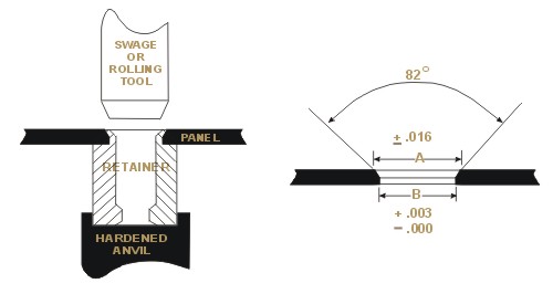 To Install UNICORP knurled shank retainers, select the hole diameter corresponding to the shank diameter from the chart below. Drill or punch hole holding a tolerance of +.002 / -.000, then simply press the retainer into the panel as illustrated. This chart applies to knurled shank retainers only.